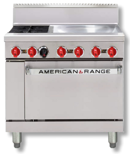 The American Range 36” Oven Range Series is designed for heavy duty use and performance in a commercial kitchen. Featuring 2 x 303mm open burners and a highly polished 16mm thick steel griddle over an integrated static oven, with reversible cast iron trivets to accept flat pans or woks.